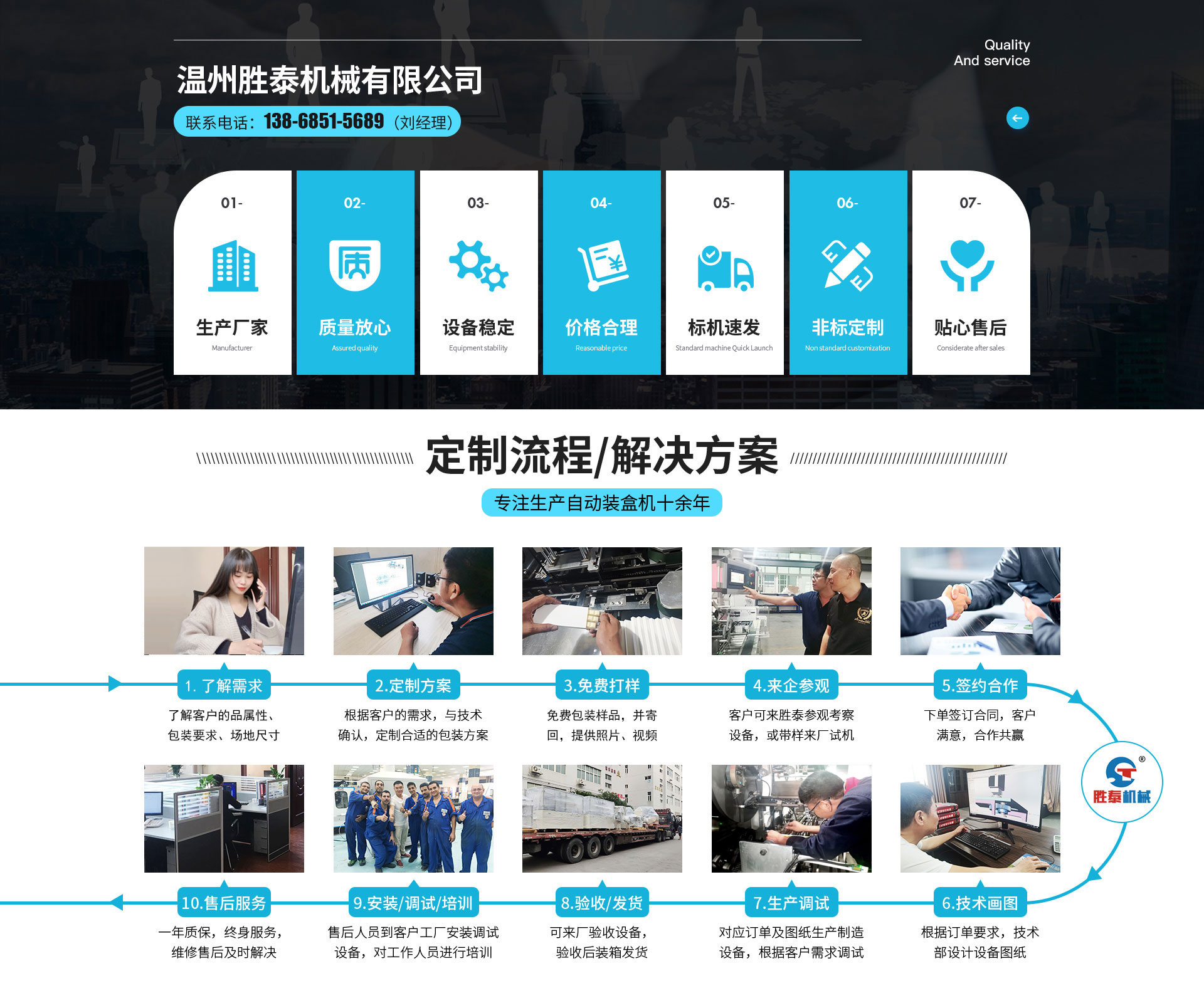 溫州勝泰機械有限公司位于東海之濱, 坐落于"包裝機械城"-溫州市。集研發(fā)、生產(chǎn)、經(jīng)貿(mào)于一體的現(xiàn)代化科技型企業(yè),是國家高新技術(shù)企業(yè),通過了CE認證、IS09001質(zhì)量體系認證,并獲得了多項專利。從事盒裝紙包裝設(shè)備10余年,具有先進的技術(shù)力量和生產(chǎn)工藝,制造經(jīng)驗豐富、產(chǎn)品質(zhì)量可靠、價格合理、能為廣大客戶提供設(shè)備、技術(shù)、原材料供應(yīng)全方位服務(wù),幫助客戶打造專業(yè)化、智能化、無人化的工業(yè)4.0工廠。